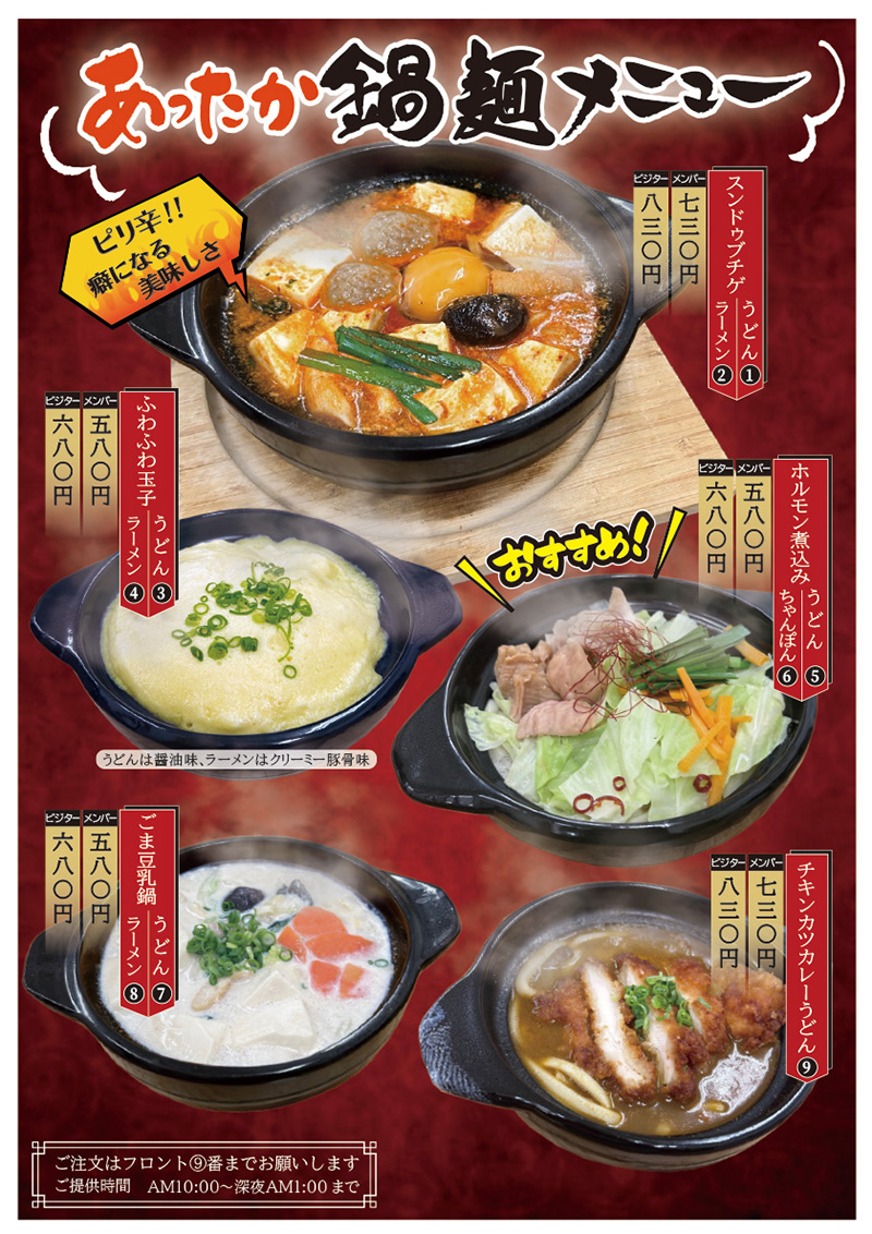 毎年好評なスンドゥブチゲは「うどん麺」or「ラーメン麺」、ホルモン煮込みは「ちゃんぽん麺」が選べます。
